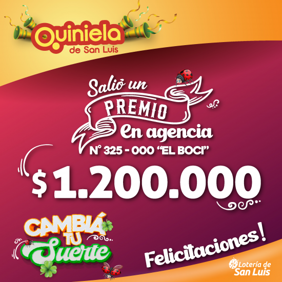El día Sábado 11 de Octubre, en la Agencia N° 325-000 "El Boci" de Justo Daract, salió un premio de Quiniela de $1.200.000