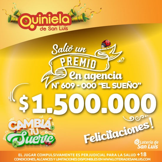El día Viernes 16 de Enero, en la Agencia N° 609-000 "El Sueño" de Justo Daract, salió un premio de Quiniela de $1.500.000