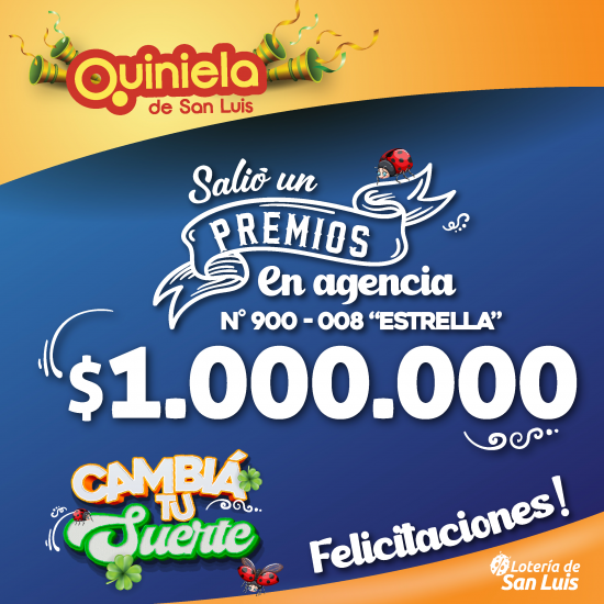 El día Viernes 26 de Septiembre, en la Agencia N° 900-008 "Estrella" de La Punta, salió un premio de Quiniela de $1.000.000