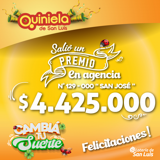 El día Martes 21 de Octubre, en la Agencia N° 129-000 "San José" de Quines, salió un premio de Quiniela de $4.425.000