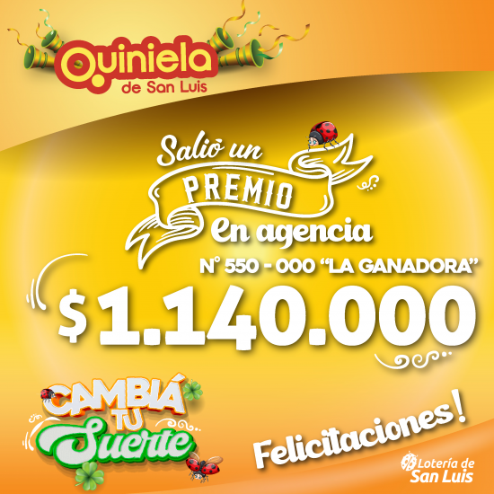 El día Lunes 1 de Diciembre, en la Agencia N° 550-000 "La Ganadora" de San Luis, salió un premio de Quiniela de $1.140.000