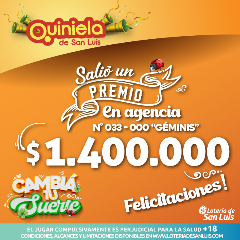 El día Jueves 4 de Diciembre, en la Agencia N° 033-000 "Géminis" de San Luis, salió un premio de Quiniela de $1.400.000