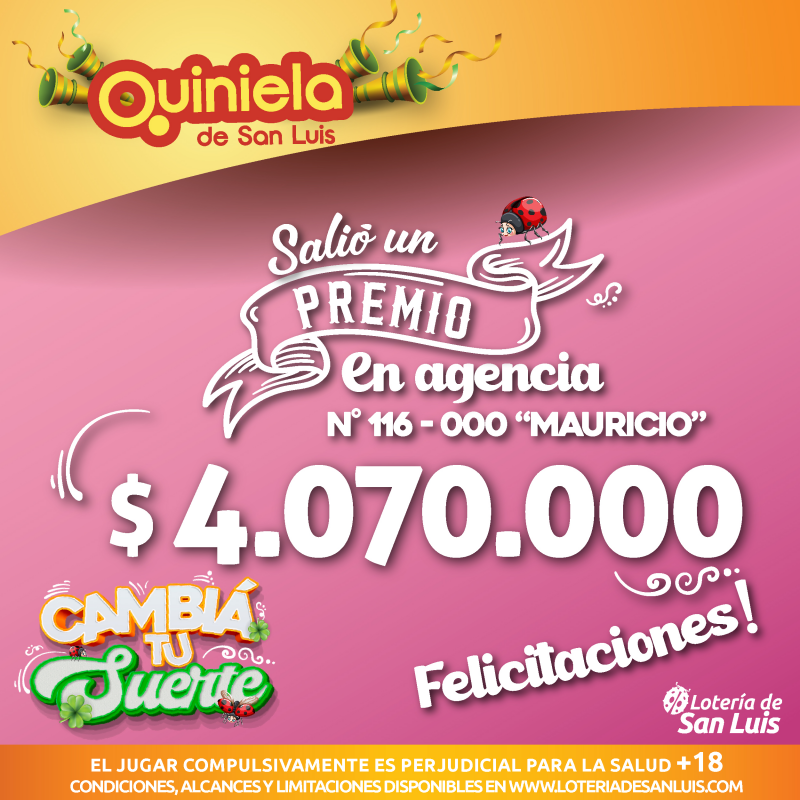 El día Martes 6 de Enero, en la Agencia N° 116-000 "Mauricio" de San Luis, salió un premio de Quiniela de $4.070.000