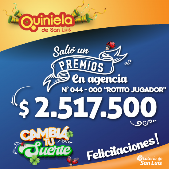 El día Viernes 26 de Septiembre, en la Agencia N° 044-000 "Rotito Jugador" de Unión, salió un premio de Quiniela de $2.517.500
