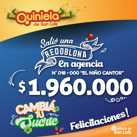 El día Sábado 29 de Noviembre, en la Agencia N° 018-000 "El Niño Cantor" de Villa Mercedes, salió un premio de Redoblona de $1.960.000
