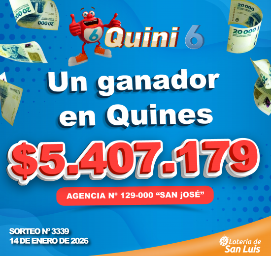 En la modalidad "Siempre Sale" del sorteo N°3339 del Miércoles 14 de Enero, un apostador que jugó en la Agencia Nº 129-000, "San José" de Quines, se llevó $5.407.179