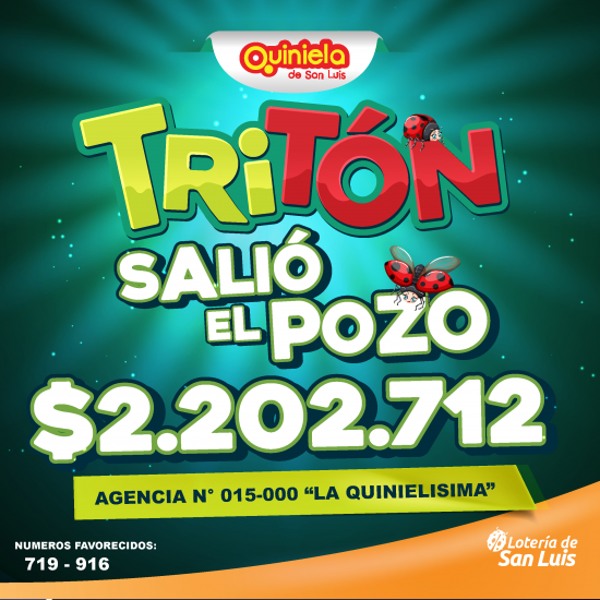 El afortunado apostador realizó su jugada en la Agencia N.º 015-000 "La Quinielisima" de San Luis, con los números: 719 - 916 y se llevó la suma de $ 2.202.712