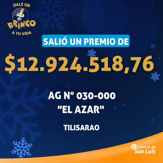 Lunes 22 de diciembre de 2025.‐ Un ganador con el Brinco en la provincia de San Luis, en esta oportunidad se alzó con un premio de $12.924.518,76.- en la modalidad “Brinco Junior Siempre Sale”.