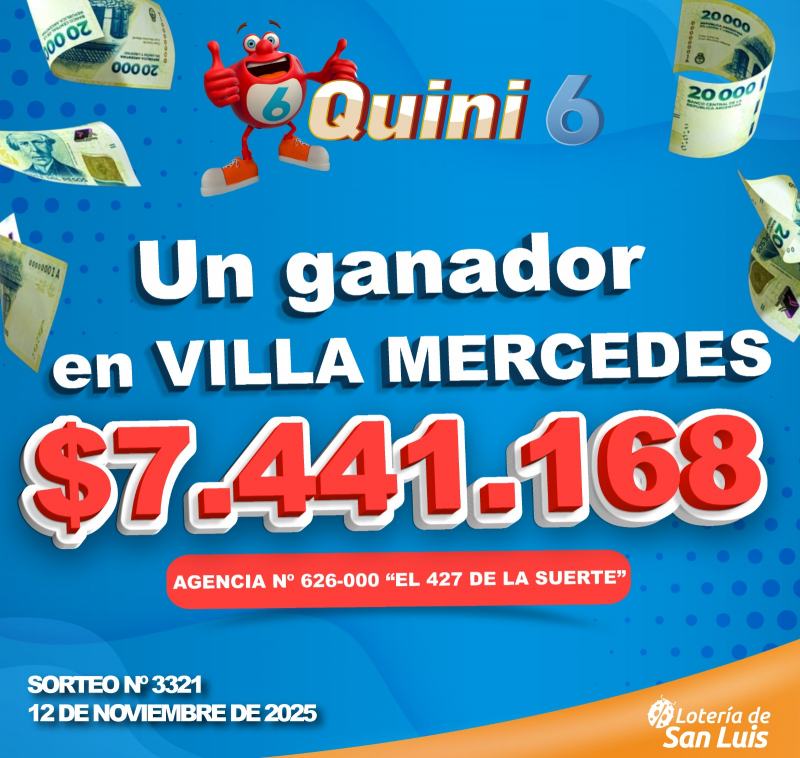 Jueves 13 de noviembre de 2025.‐ Un ganador con el Quini 6 en la provincia de San Luis, en esta oportunidad se alzó con un premio de $7.441.168,99 en la modalidad “Siempre Sale”.