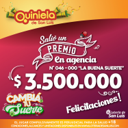 ¡Salió un premio de Quiniela en Nueva Galia! El día Jueves 14 de Enero, en la Agencia N° 046-000 "La Buena Suerte" de Nueva Galia, salió un premio de Quiniela de $3.500.000 ¡Felicitaciones al afortunado ganador!