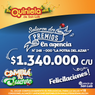 ¡Salieron dos premios de Quiniela en Juana Koslay! El día Sábado 10 de Enero, en la Agencia N° 448-000 "La Potra del Azar" de Juana Koslay, salieron dos premios de Quiniela de $1.340.000 c/u ¡Felicitaciones a los afortunados ganadores!