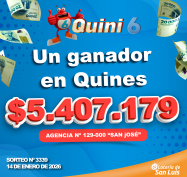 ¡Un ganador del Quini 6 en Quines! En la modalidad "Siempre Sale" del sorteo N°3339 del Miércoles 14 de Enero, un apostador que jugó en la Agencia Nº 129-000, "San José" de Quines, se llevó $5.407.179 ¡Felicitaciones al afortunado ganador!