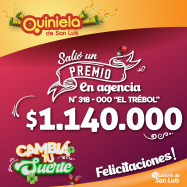 ¡Salió un premio de Quiniela en San Luis! El día Lunes 20 de Octubre, en la Agencia N° 318-000 "El Trébol" de San Luis, salió un premio de Quiniela de $1.140.000 ¡Felicitaciones al afortunado ganador!