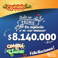 ¡Salió un premio de Quiniela en San Luis! El día Viernes 17 de Octubre, en la Agencia N° 115-000 "Bresano" de San Luis, salió un premio de Quiniela de $8.140.000 ¡Felicitaciones al afortunado ganador!