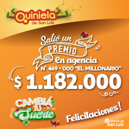 ¡Salió un premio de Quiniela en Villa Mercedes! El día Martes 21 de Octubre, en la Agencia N° 469-000 "El Millonario" de Villa Mercedes, salió un premio de Quiniela de $1.182.000 ¡Felicitaciones al afortunado ganador!