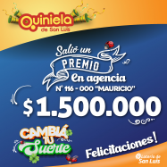 ¡Salió un premio de Quiniela en San Luis! El día Viernes 17 de Octubre, en la Agencia N° 116-000 "Mauricio" de San Luis, salió un premio de Quiniela de $1.500.000 ¡Felicitaciones al afortunado ganador!