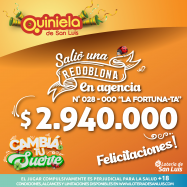 ¡Salió un premio de Redoblona en Candelaria! El día Lunes 15 de Diciembre, en la Agencia N° 028-000 "La Fortuna-Ta" de Candelaria, salió un premio de Redoblona de $2.940.000 ¡Felicitaciones al afortunado ganador!