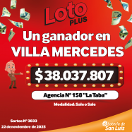 Un ganador con el Loto Plus en la provincia de San Luis; en esta oportunidad se alzó con un premio de $38.037.807,16 en la modalidad “Sale o Sale”. La apuesta ganadora se realizó en la Ciudad de Villa Mercedes, más precisamente en la agencia 158-000 “La Taba”, situada en la calle Juan Llerena 68. En esta oportunidad, el agenciero vendedor del ...