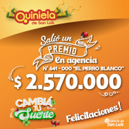 ¡Salió un premio de Quiniela en Potrero de los Funes! El día Miércoles 26 de Noviembre, en la Agencia N° 641-000 "El Perro Blanco" de Potrero de los Funes, salió un premio de Quiniela de $2.570.000 ¡Felicitaciones al afortunado ganador!