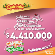 ¡Salió un premio de Redoblona en San Luis! El día Jueves 18 de Septiembre, en la Agencia N° 176-000 "Clemente" de San Luis, salió un premio de Redoblona de $4.410.000 ¡Felicitaciones al afortunado ganador!