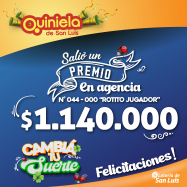 ¡Salió un premio de Quiniela en San Luis! El día Martes 16 de Septiembre, en la Agencia N° 007-000 "La Millonaria" de San Luis, salió un premio de Quiniela de $2.200.000 ¡Felicitaciones al afortunado ganador!