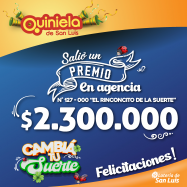 ¡Salió un premio de Quiniela en Villa Mercedes! El día Jueves 18 de Septiembre, en la Agencia N° 127-000 "El Rinconcito de la suerte" de Villa Mercedes, salió un premio de Quiniela de $2.300.000 ¡Felicitaciones al afortunado ganador!