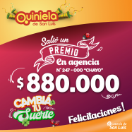 ¡Salió un premio de Quiniela en Villa Mercedes!   El día Sábado 10 de Febrero en la agencia Nº 247-000 "Chayo" de Villa Mercedes salió un premio de Quiniela de $880.000   ¡Felicitaciones al afortunado ganador!