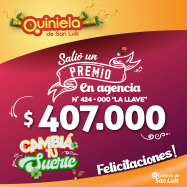 ¡Salió un premio de Quiniela en Villa Mercedes!   El día Lunes 12 de Febrero en la agencia Nº 424-000 "La Llave" de Villa Mercedes salió un premio de Quiniela de $407.000   ¡Felicitaciones al afortunado ganador!