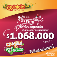 ¡Salió un premio de Quiniela en San Luis!   El día Lunes 12 de Febrero en la agencia Nº 479-000 "El Profesor" de San Luis salió un premio de Quiniela de $1.068.000   ¡Felicitaciones al afortunado ganador!