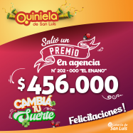 ¡Salió un premio de Quiniela en San Luis!   El día Jueves 15 de Febrero en la agencia Nº 202-000 "El Enano" de San Luis salió un premio de Quiniela de $456.000   ¡Felicitaciones al afortunado ganador!