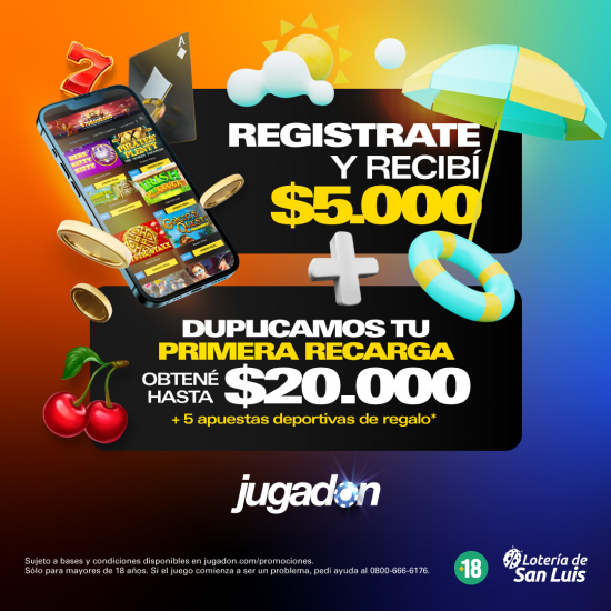 SE OTORGARÁ UN CÓDIGO PROMOCIONAL POR EL DOBLE DEL MONTO CARGADO Y JUGADO, DESDE $1.000 CON TOPE DE BONO DE $20.000, COMO CRÉDITO JUGABLE. EL IMPORTE REINTEGRADO ES DE CARÁCTER “JUGABLE”, ES DECIR QUE SOLO PUEDE UTILIZARSE PARA JUGAR EN EL SITIO WEB JUGADON.COM Y NO PUEDE SER EXTRAÍDO DE LA CUENTA DE USUARIO. LAS GANANCIAS GENERADAS CON EL IMPORTE DEL BONO, UNA VEZ DESBLOQUEADO AL CUMPLIR CON LA CONDICIÓN ROLLOVER, SÍ PODRÁN SER RETIRADAS DE LA CUENTA.