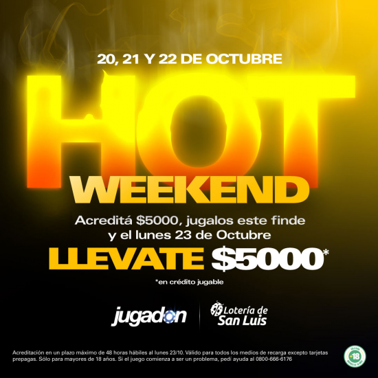 SE OTORGARÁN CÓDIGO/S PROMOCIONAL/S DE ACUERDO A LA SIGUIENTE TABLA DE EQUIVALENCIAS SI LA RECARGA REALIZADA POR EL USUARIO EN SU CUENTA ES DE $5.000 (PESOS CINCO MIL CON 00/100) O SUPERIOR; Y JUGADO EN APUESTAS POR UN SUMATORIA MÍNIMA A $5.000: SE ENTREGARÁN BONOS PROMOCIONALES POR UN TOTAL DE $5.000 (PESOS CINCO MIL CON 00/100), COMO ÚNICO MONTO DE ACREDITACIÓN EN CONCEPTO DE BONO PARA ESTA PROMOCIÓN. PUDIENDO EL USUARIO PARTICIPAR Y RECIBIR EL BONO HOTWEEKEND CORRESPONDIENTE AL PERÍODO 1 (DEL DÍA 20 AL 22 DE OCTUBRE DE 2023) Y/O PERÍODO 2 (DEL DÍA 27 AL 29 DE OCTUBRE DE 2023). SIEMPRE Y CUANDO CUMPLA CON LAS CONDICIONES MENCIONADAS, PERO DE MANERA INDEPENDIENTE, NO SIENDO ACUMULATIVAS LAS RECARGAS, JUGADAS, ENTRE LOS DOS PERÍODOS.