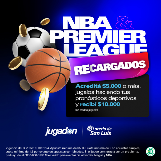 ESTA PROMOCIÓN ES VÁLIDA EXCLUSIVAMENTE PARA APUESTAS DEPORTIVAS REALIZADAS A LOS EVENTOS DE NBA Y/O PREMIER LEAGUE EXCLUSIVAMENTE; PARA SER VÁLIDAS LAS APUESTAS DEBEN CUMPLIMENTAR CON LAS CONDICIONES EXPLICITADAS EN EL APARTADO SEXTO. LAS APUESTAS DEBEN SER REALIZADAS Y RESUELTAS DURANTE LOS DÍAS COMPRENDIDOS POR LA PROMOCIÓN, ENTRE LAS 00:00 DEL SABADO 30/12/2023 Y LAS 23:59 DEL LUNES 01/01/2024, EN EL SITIO WWW.JUGADON.COM.