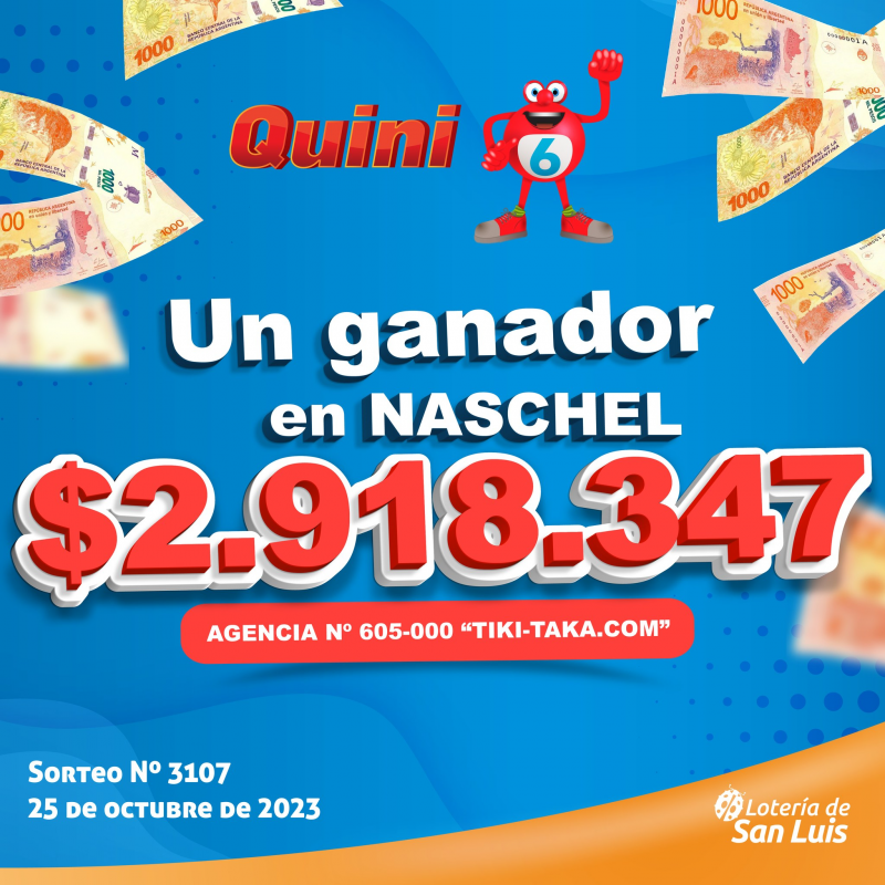El afortunado apostador jugó su cupón en la Agencia Nº 605-000 "Tiki-Taka.Com" de Naschel y se llevó un premio en la modalidad "Siempre Sale" de $2.918.347