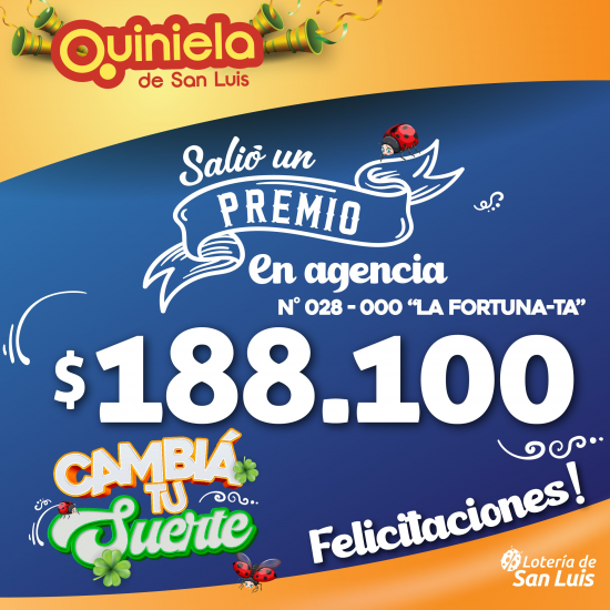 El día Viernes 02 de Junio en la agencia Nº 028-000 "La Fortuna-Ta" de Candelaria salió un premio de Quiniela de $188.100.