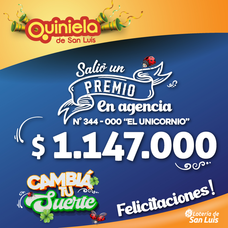 El día Jueves 30 de Octubre, en la Agencia N° 344-000 "El Unicornio" de Juana Koslay, salió un premio de Quiniela de $1.147.000