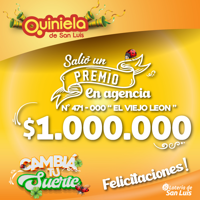 El día Martes 7 de Octubre, en la Agencia N° 471-000 "El Viejo León" de Merlo, salió un premio de Quiniela de $1.000.000
