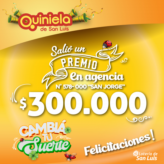 El día Sábado 04 de Noviembre en la agencia Nº 578-000 "San Jorge" de Potrero de Los Funes salió un premio de Quiniela de $300.000
