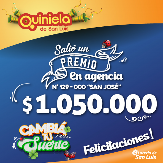 El día Viernes 31 de Octubre, en la Agencia N° 129-000 "San José" de Quines, salió un premio de Quiniela de $1.050.000