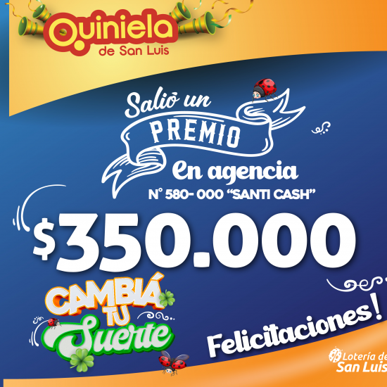 El día Miércoles 18 de Octubre en la agencia Nº 580-000 "Santi Cash" de San Luis salió un premio de Quiniela de $350.000