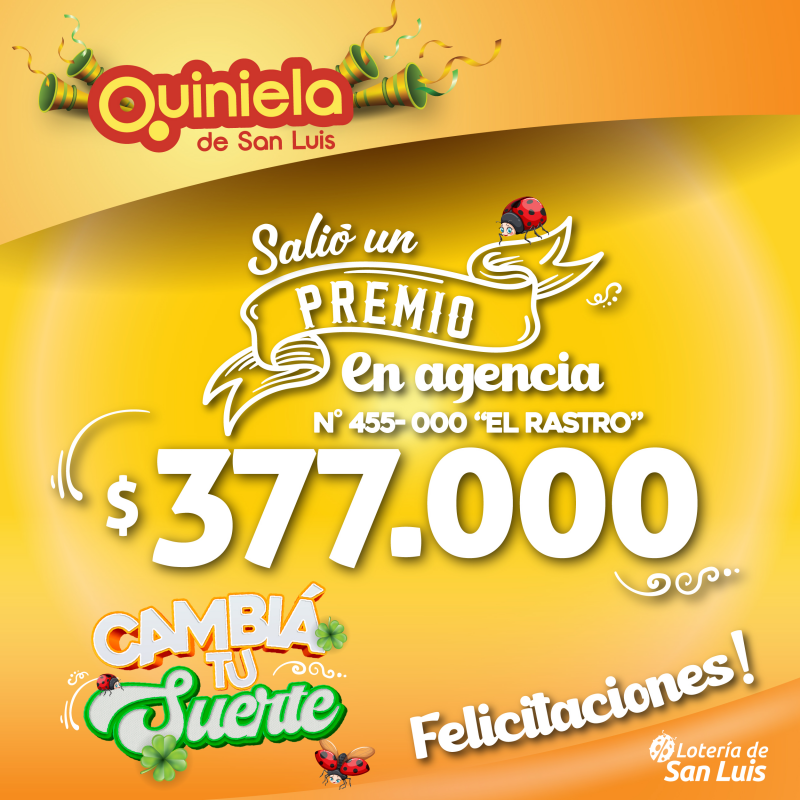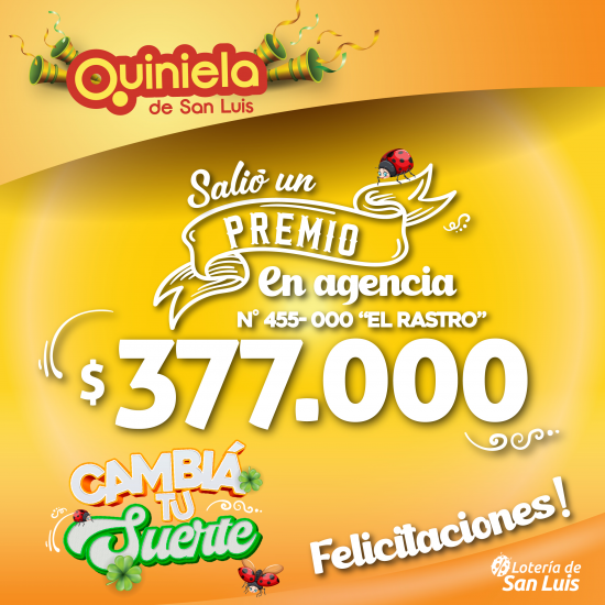 El día Sábado 04 de Noviembre en la agencia Nº 455-000 "El Rastro" de San Luis salió un premio de Quiniela de $377.000