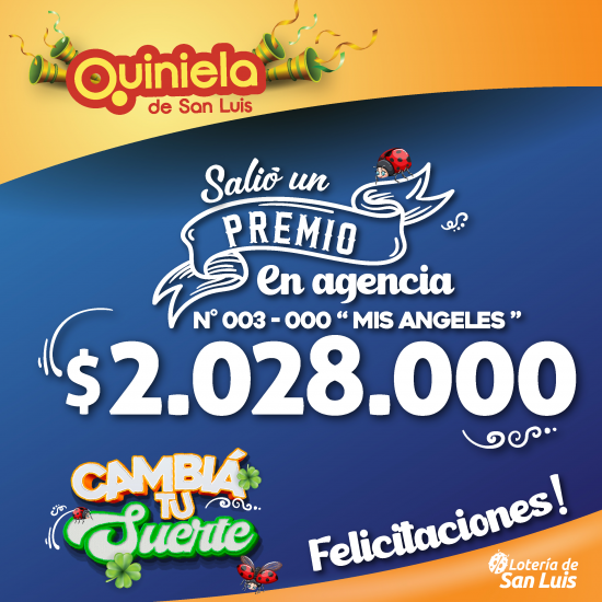 El día Miércoles 08 de Octubre, en la Agencia N° 003-000 "Mis Angeles" de San Luis, salió un premio de Quiniela de $2.028.000