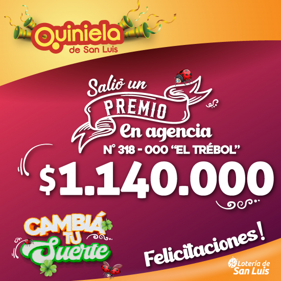 El día Lunes 20 de Octubre, en la Agencia N° 318-000 "El Trébol" de San Luis, salió un premio de Quiniela de $1.140.000