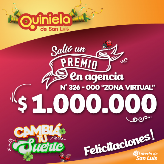El día Jueves 20 de Noviembre, en la Agencia N° 326-000 "Zona Virtual" de San Luis, salió un premio de Quiniela de $1.000.000