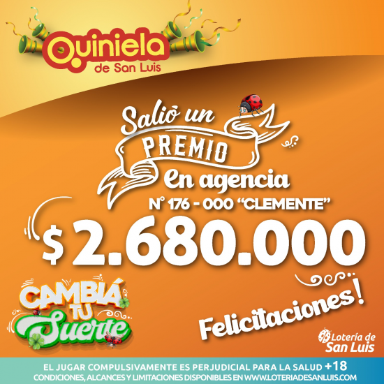 El día Sábado 20 de Diciembre, en la Agencia N° 176-000 "Clemente" de San Luis, salió un premio de Quiniela de $2.680.000