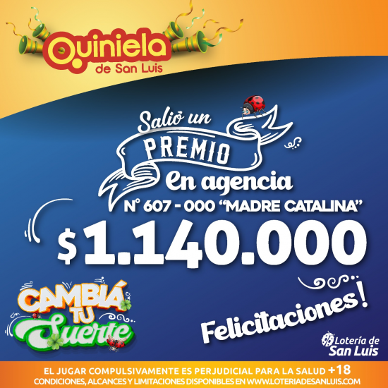 El día Viernes 26 de Diciembre, en la Agencia N° 607-000 "Madre Catalina" de San Luis, salió un premio de Quiniela de $1.140.000