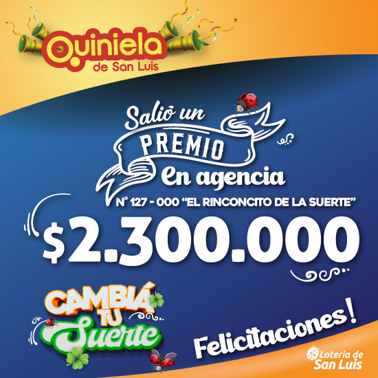 El día Jueves 18 de Septiembre, en la Agencia N° 127-000 "El Rinconcito de la suerte" de Villa Mercedes, salió un premio de Quiniela de $2.300.000