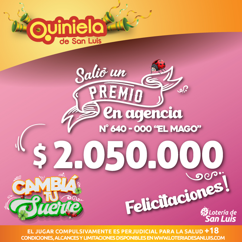 El día Sábado 13 de Diciembre, en la Agencia N° 640-000 "El Mago" de Villa Mercedes, salió un premio de Quiniela de $2.050.000
