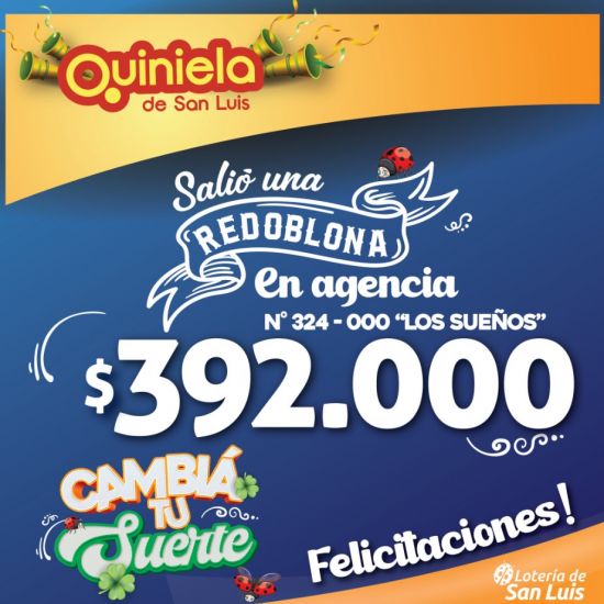 El día Lunes 11 de Septiembre en la agencia Nº 324-000 "Los Sueños" de Villa Mercedes, salió un premio de Redoblona de $392.000