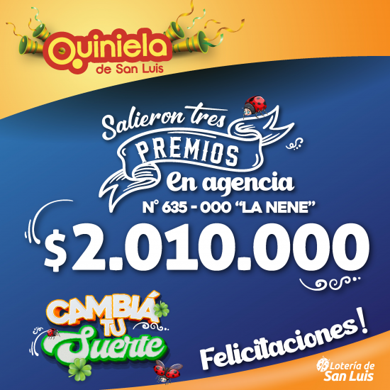 El día Sábado 20 de Septiembre, en la Agencia N° 635-000 "La Nene" de Santa Rosa del Conlara , salieron tres premios de Quiniela de $2.010.000 c/u
